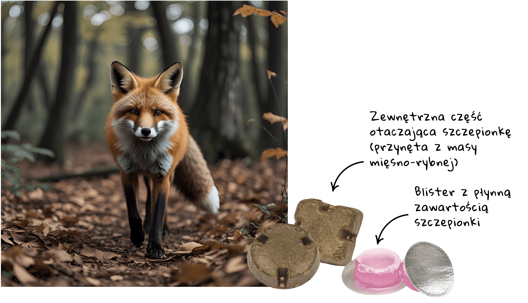 Wykładana przynęta wydaje specyficzny zapach, zawiera w środku aluminiowo-plastikowy pojemnik z płynną szczepionką, której działanie uodparniające skierowane jest wyłącznie na lisy.