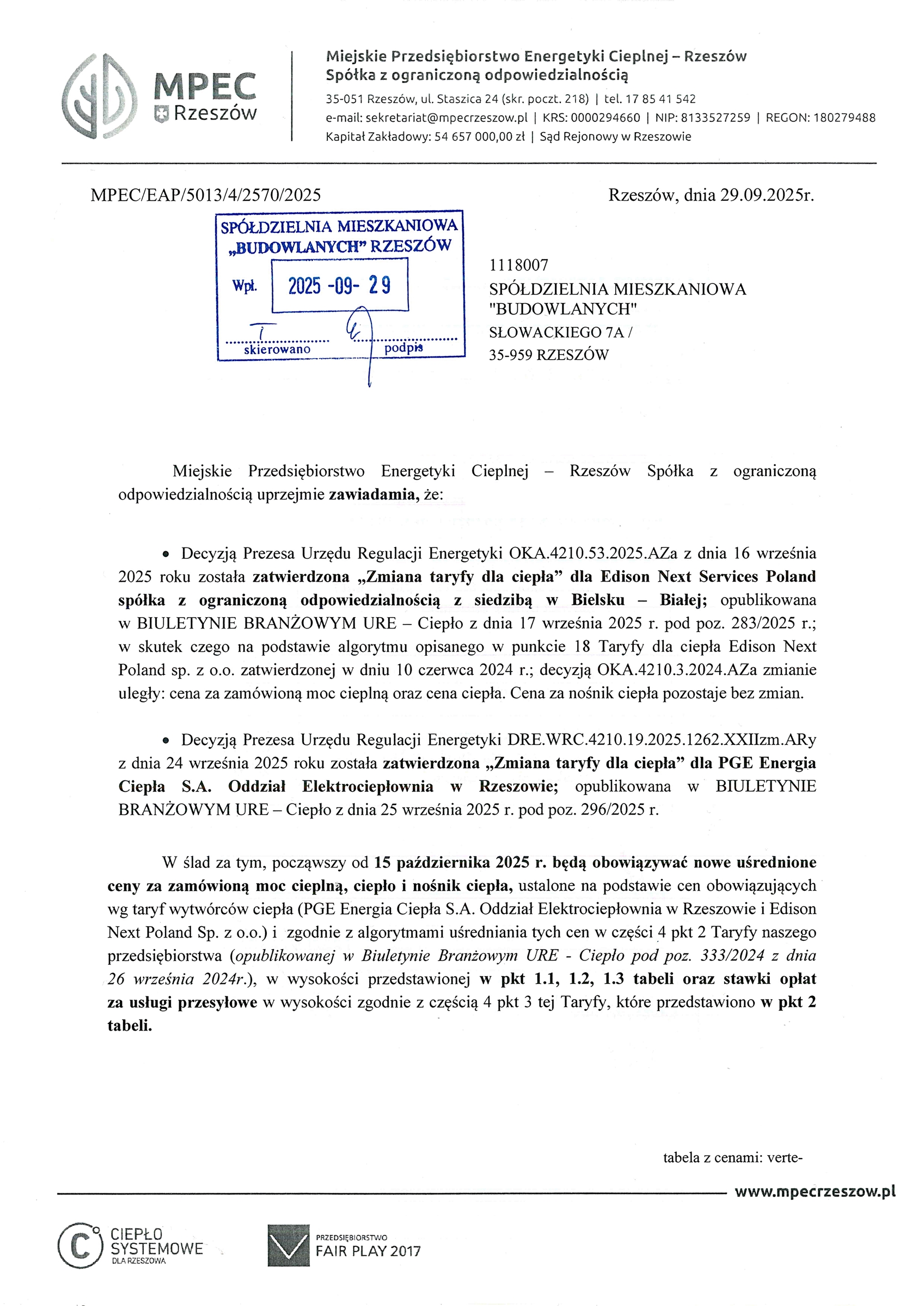 Poniżej treść zawiadomienia MPEC Rzeszów Sp. z o.o. :