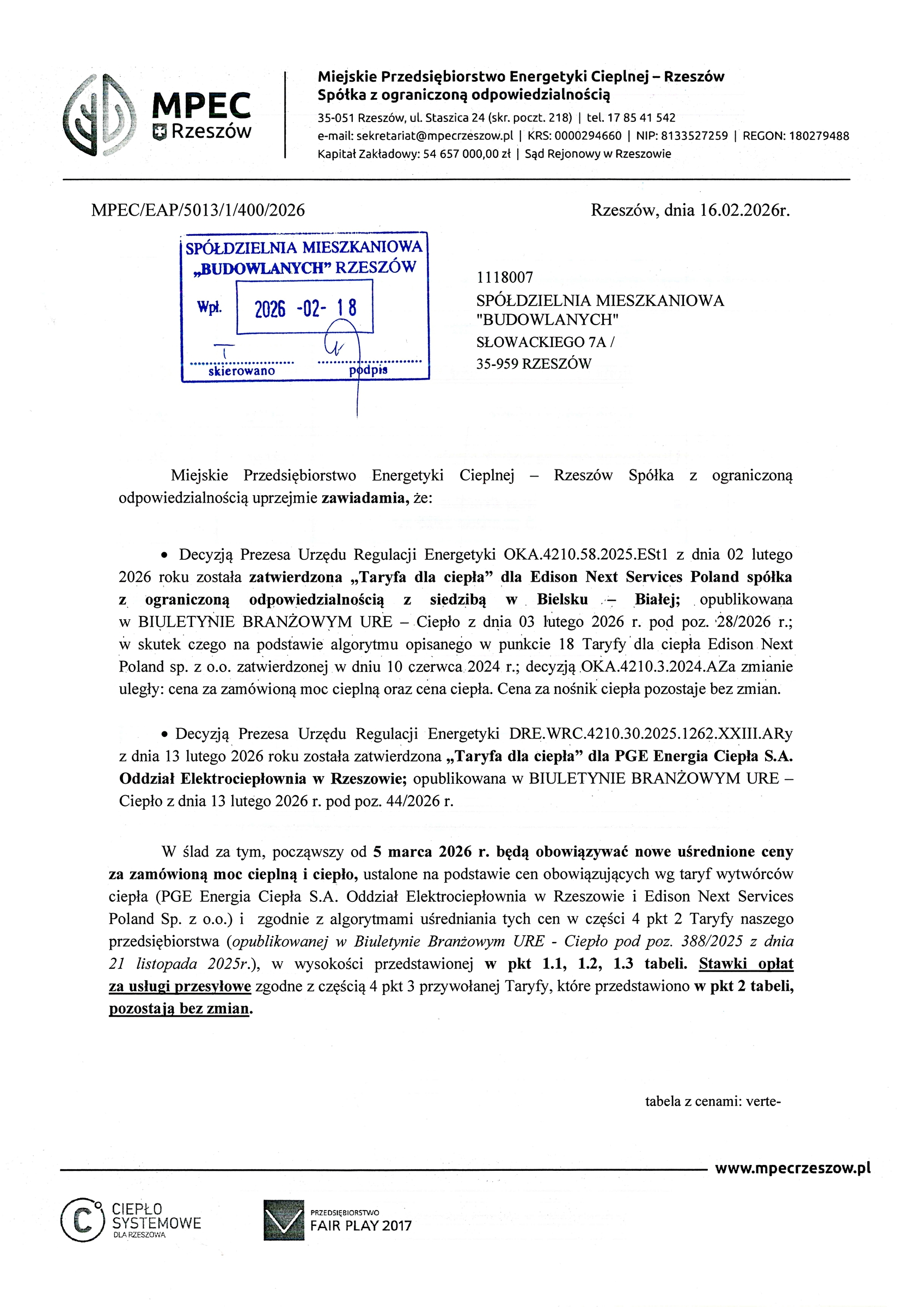 Poniżej treść zawiadomienia MPEC Rzeszów Sp. z o.o. :