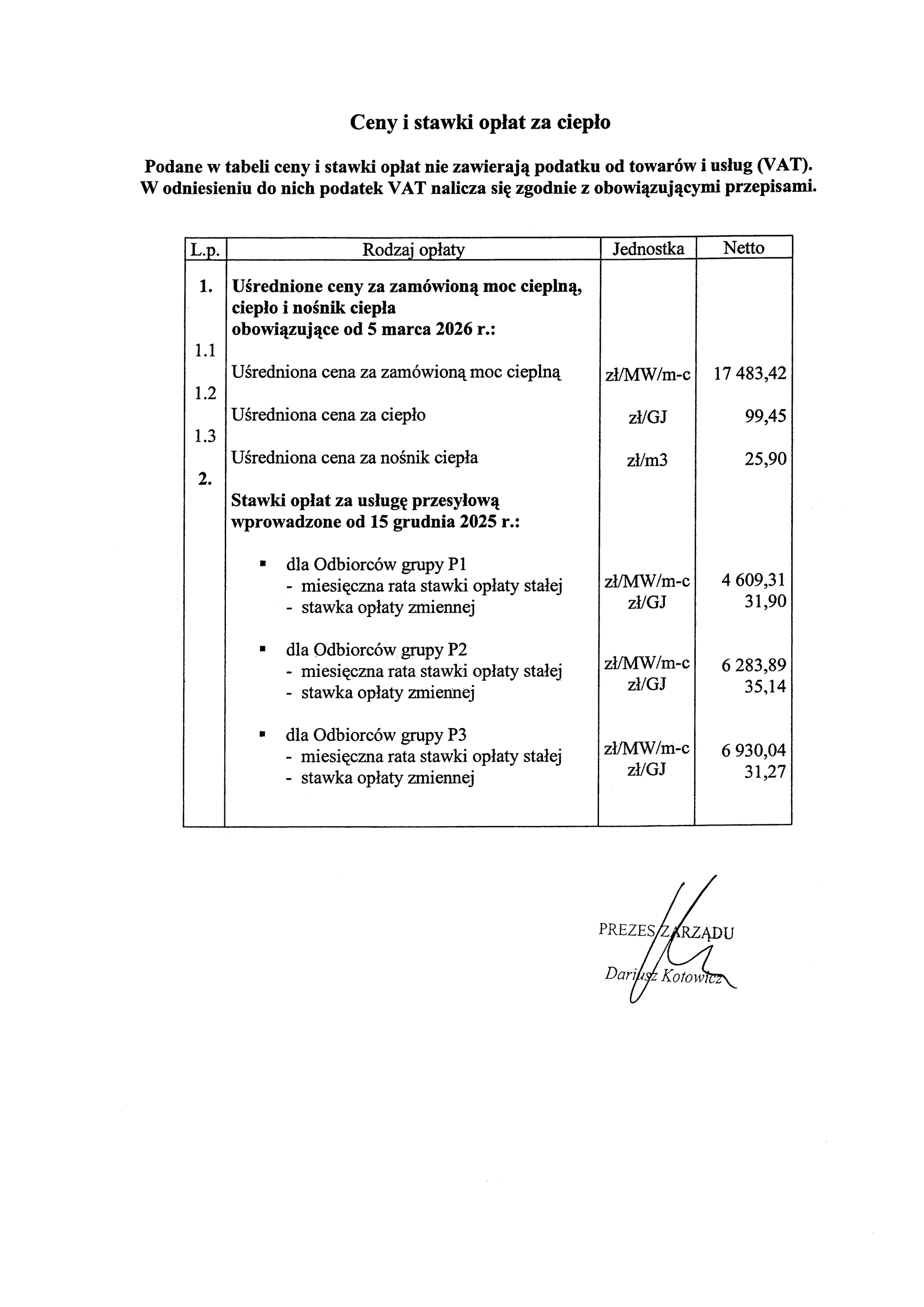 Cena za nośnik ciepła pozostaje bez zmian.